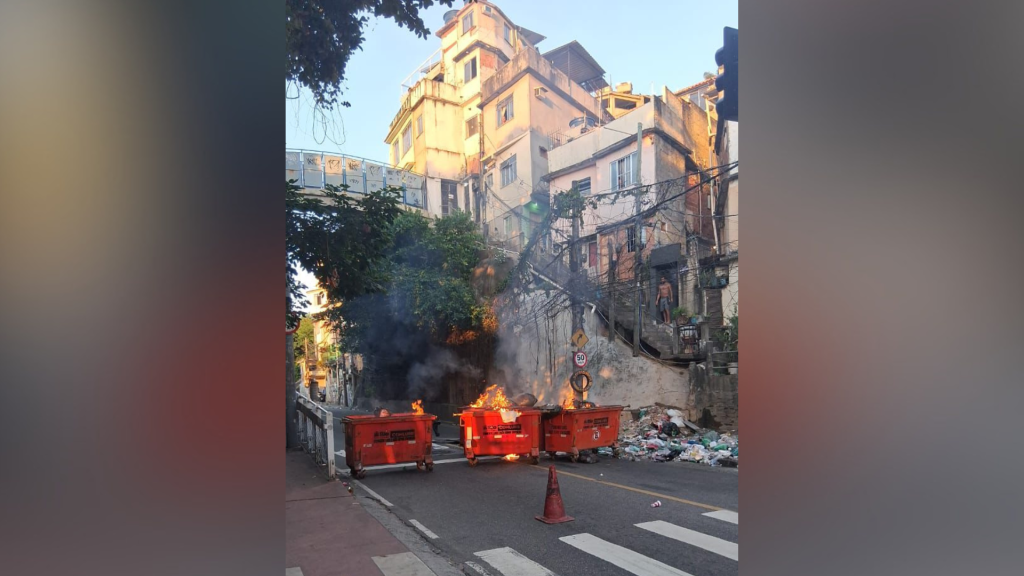 Caçambas foram incendiadas na avenida Niemeyer, próxima a passarela do Vidigal, na zona Sul do Rio • Reprodução